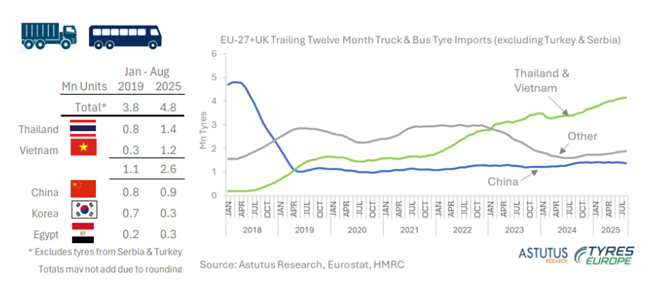 卡客车轮胎进口量同比增长近14%,55%来自泰国和越南。