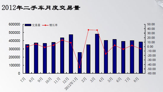 从上图可以看出,今年8月份二手车的交易量,环比出现了一定程度的下滑,而去年8月较前一个月相比,呈现增长态势。从图表来看,今年前8个月,全国二手车的交月度易量略微呈现前高后低的走势。