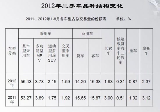 另一方面,国内二手车市场的交易结构,日趋与新车市场的交易结构相类似。MPV今年和去年前8个月的累计交易量保持平稳,SUV今年1-8月的累计交易量较去年同期有了较大增幅,这与近几年这一车型的畅销有关,为二手车市场带来了基础性的资源。