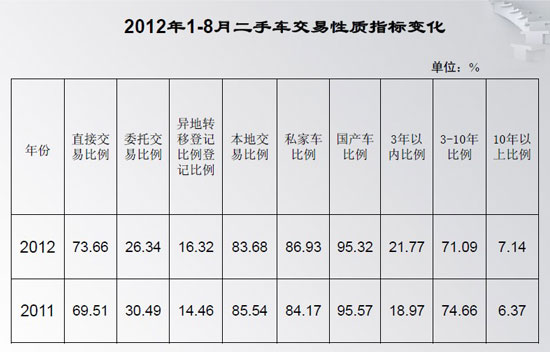 第三,二手车交易性质呈现出一定特色。这首先体现在2012年二手车的直接交易比例偏高,达到73.66%,比去年同期增加了4.15个百分点,而委托交易比例却下降了4.15%。