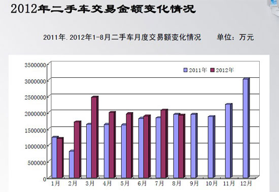 今年8月份,二手车市场的交易金额不是特别理想。从前面可以看出,8月份最主力的交易产品——轿车的交易量,环比7月份下降较大,而轿车一般档次比较高,交易额比较大。据分析,主力品种的缺失,是导致8月单车交易价格环比下降的原因。