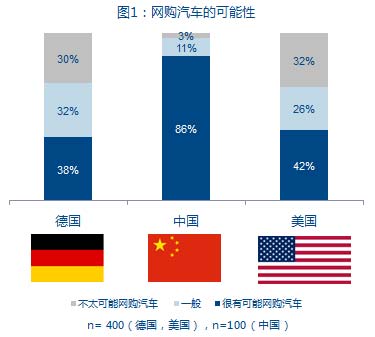 在调研中,理特向消费者询问他们是否愿意网购汽车,以及网购的可能性。结果表明,很多消费者愿意网购汽车,其中中国消费者网购汽车的可能性是德国和美国消费者的两倍(见图1)。