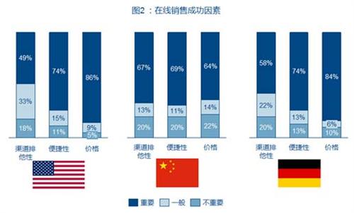 同样的成功因素也能促进汽车销售。理特的客户调研结果同样也确认了这一趋势。对于美国和德国的销售者,网购汽车的价格优势仍然是他们最主要的考虑因素。但是调研结果同样表明,便捷性和渠道排他性也很重要(见图2)。而对于中国消费者而言,价格优势相对不是很重要,他们更看重购买渠道的排他性。