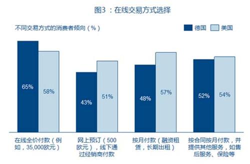 在线购买的最大障碍在于最后的交易环节。消费者对线上交易服务的偏好调查表明,他们希望有不同的交易选择。线上消费者需要可以选择全额付款、按揭以及其他的付款方式。图3是德国美国不同交易方式消费者倾向的比例。