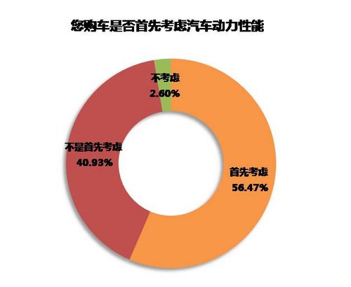 在“购车是否首先考虑汽车动力性能”的调查中,有56.47%的调查参与者把动力性能作为购车的首要考虑条件,只有2.6%的消费者调查者选择“不考虑动力性能”,比例很小,汽车动力性能的重要性不言而喻。