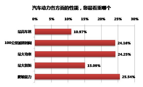 在“汽车动力各方面性能中您最看中哪个”的调查中,各有大约四分之一的调查者选择了“百公里加速时间”、“最大功率”及“爬坡能力”,总共占到了75%,而“最高车速”却只有10%的调查者选择。