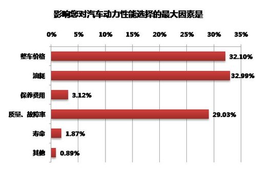 在“影响您对汽车动力性能选择的最大因素”的调查中,有32.1%、32.99%、29.03%的调查者,分别选择“整车价格”、“油耗和质量”,以及“故障率”,其他选择的占比较少。
