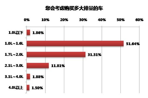 在“您会考虑购买多大排量的车”的调查中,选择1.0L~1.6L区间排量汽车的受调查者占到了51.4%。他们表示,1.6L排量的汽车已能基本上满足驾车需要,例如伊兰特、宝来等一些市场份额较大的中低端车型,排量都在1.6L以下。