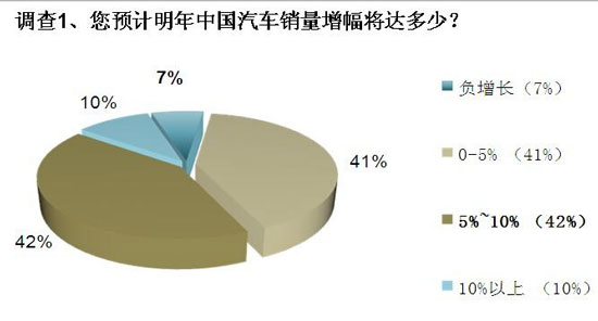 首先,就2013年车市的增长预期而言,主流观点显得较为谨慎,但不失乐观。调查1的结果显示,超过八成的参与者认为,明年车市增幅相较于今年不会有太大的波动,将维持在10%以内,但认为增长将超过5%的人士更多;此外,有10%的人士认为,明年车市的增幅可能超过10%;7%认为可能出现负增长。