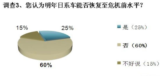 在调查3中,有25%人士认为,日系车在明年恢复甚至超越危机之前的水平并非不可能完成的任务。而剩余15%的参与者认为,能否恢复不好判断,选择了"不好说"。