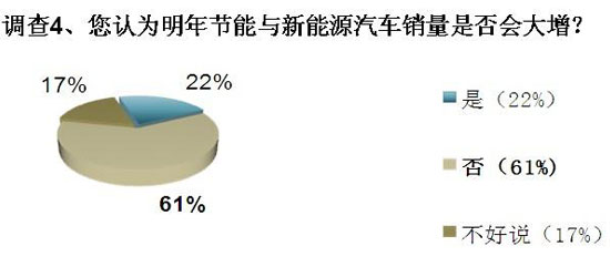在最后一个调查问题中,我们对节能与新能源汽车明年的市场表现进行了预测,其中,有多达61%的参与者认为,节能与新能源汽车明年销量不会出现大规模增加,22%的参与者则持有相反观点。此外,17%的参与者表示不好判断。