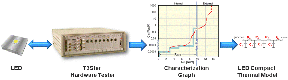 例如,将明导公司的 T3Ster 硬件联接到被测元件上,就能测量结的瞬态温度变化,不论是元件的加热过程或冷却过程,都可精确到0.01摄氏度。在热量从结散发到周边环境的过程中,能够在一分钟内采集到一万多个数据点来描述结温的瞬态变化,而结温的瞬态变化特征就表示了元器件各层的热阻和热容情况。有了这些数据,利用分析软件能够自动生成 LED 简化热模型。一个精确有效的模型就这样诞生了。