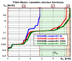 在热阻-热容图表中,蓝色线条表示刚生产出来的 LED,其他线条分别表示用过500小时、2000小时和3000小时的 LED。通过水平方向可见,代表用过的 LED 的线条上有一个高热阻层,这说明该位置出现材料分离的情况,空气的导热系数比原有材料要小很多。这一类型的故障诊断测试能用于 LED 和IC封装。