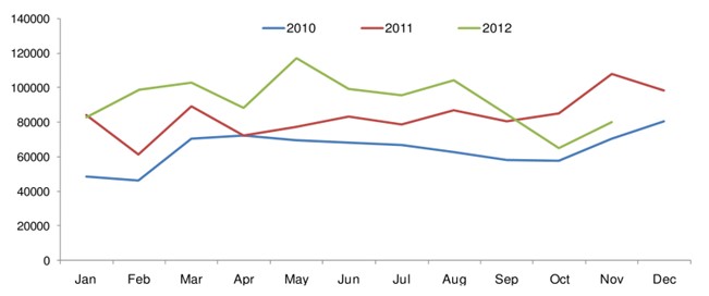 2012年1~11月,海关汽车进口量为101.7万辆,第一次单年累计进口量超过百万辆台阶,同比增长回落到12.4%,其中乘用车进口99.7万辆,同比增长12.8%。