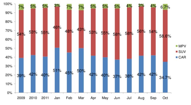 11月,进口CAR、SUV和MPV分别为2.9万、4.6万和0.46万辆,份额分别为36.2%、57.8%和6.0%。