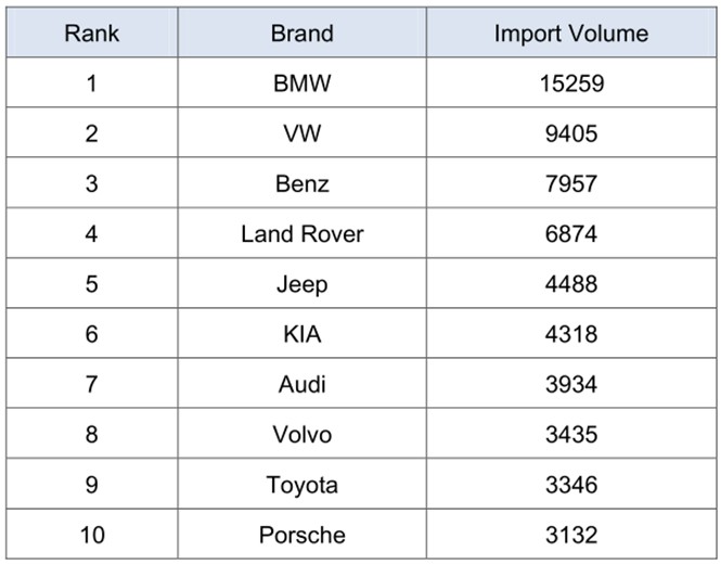 11月,乘用车品牌排名出现较大变化,奔驰重回前三。日系品牌中丰田有所恢复,雷克萨斯恢复到1000辆以上。