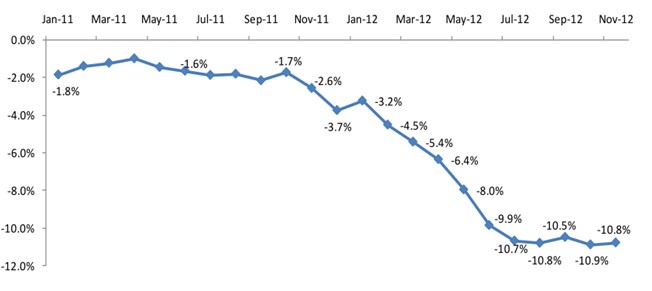 2012年11月,海关汽车进口量为7.98万辆,同比负增长26.1%。11月份延续10月份进口走势,是2012年连续第二个月进口车市场海关进口量出现负增长。