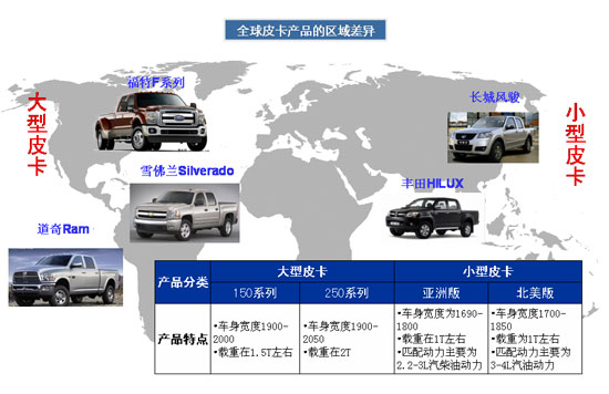 由于东、西方文化、使用环境和消费需求的差异,皮卡产品也具有明显的区域特征:北美地区主要是大型皮卡产品;中国和东南亚地区主要是小型皮卡产品。其中,前者造型剽悍、车身宽大、底盘高、功率大;后者小巧玲拢、省油廉价。