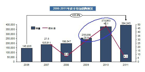 皮卡在中国的汽车目录中划归货车范畴,因此被当做货车一样进行限制管理和收取税费,严重限制了这一行业的发展。但是2009-2010年,受益于 “汽车下乡”和“以旧换新”政策,皮卡市场快速扩容,去年其市场规模达到39.4万辆。