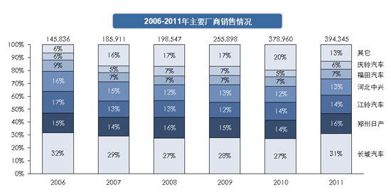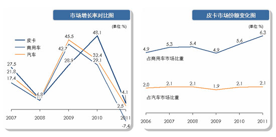 目前,皮卡占汽车市场和商用车市场的比重仍处于较低水平,但从最近几年的市场发展情况来看,2010-2011年,皮卡市场增速明显高于商用车和汽车整体市场增速。皮卡占商用车的市场比重,由2009年的4.9%提高到了2011年的6.3%。