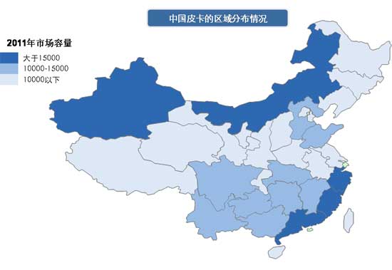 从区域市场来看,皮卡主要分布在广东、浙江、福建、内蒙、新疆、湖南、云南、广西和四川等省份。