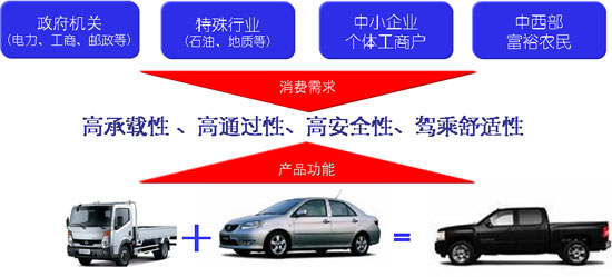 但是皮卡市场增长的内在动力,还在于产品的功能属性与各类消费群体的需求达到平衡。皮卡产品的功能优势在于:首先是它兼具了家用车和商用车的双重特性(客货两用),具有显著的单位和家庭工具车特征;其次是它构造多样化,从而满足了更广泛的需求(双门或四门、长货厢或短货厢、两驱或四驱、汽油或柴油发动机)。