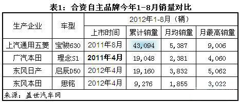 根据盖世汽车网整理的数据,今年1-8月,中国自主品牌汽车销量共计254.88万辆,而其中目前已上市的四款合资自主品牌(广汽本田“理念”、上汽通用五菱“宝骏”、东风日产“启辰”和东风本田“思铭”)的销量合计仅有9.06万辆。这一数字在整个自主品牌销量中看似微不足道,但其中单个合资自主品牌的销量却已足以媲美甚至高于许多中小型自主汽车企业的销量。如,宝骏630今年1-8月累计实现销售4.31万辆,已超过东风乘用车、华泰汽车等企业今年前8月的销量。