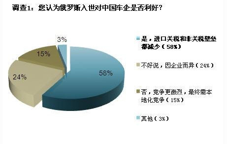 在盖世汽车网最近进行的一项调查中(调查时间2012年8月27日至8月31日,参与人士1201位),多数汽车行业人士认为,俄罗斯入世对中国汽车企业是利好,投票比例为58%,而反对该观点的人仅占15%。另外有多达24%的人士认为,中国出口汽车企业众多且产品各异,是否利好因企业而异。