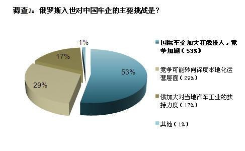 俄罗斯入世对为中国汽车企业带来哪些主要挑战呢?据调查2的结果,“国际车商加大在俄投入,竞争加剧”获得了最多选票,约53%的参与者认为这是中国汽车企业面临的主要挑战。其他两个选项“竞争可能转向深度本地化运营层面”和“俄加大对当地汽车工业的扶持力度”,分别获得了29%和17%的投票。另有约1%的人士选择了“其他”。