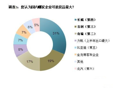 在关于“哪家中国汽车厂商可能获益最大”的调查问题中,长城汽车获得了最高选票——31%;吉利、奇瑞与力帆与分别获得了19%,17%与8%的投票;比亚迪、北汽与金龙等客车等企业获得的投票较少。