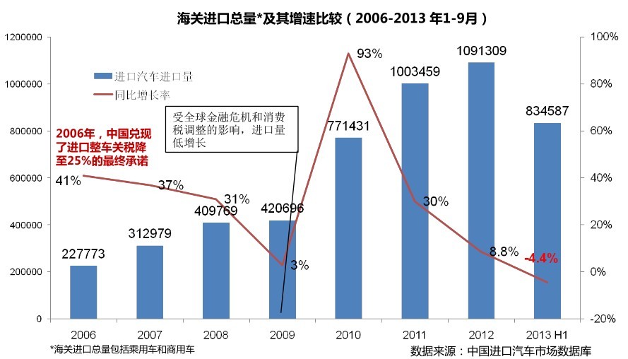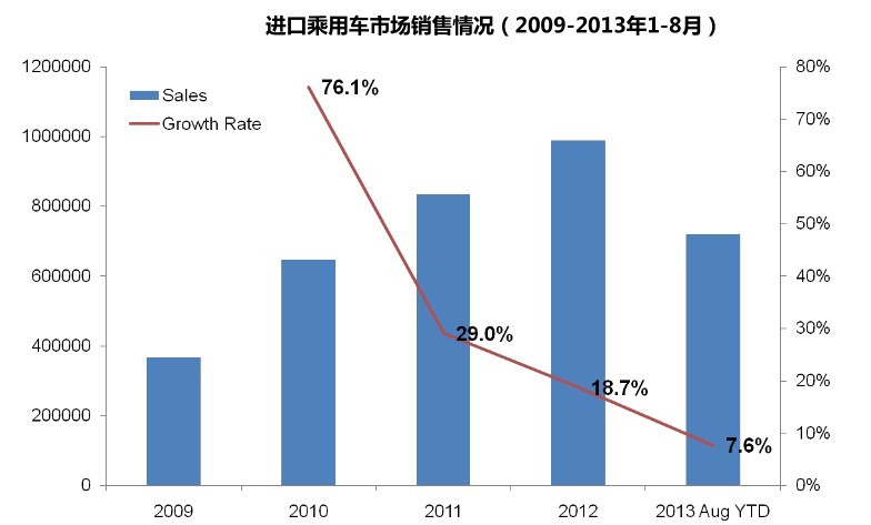(二)需求大幅放缓:2013年1-8月进口车市场销售71.9万辆,同比增长7.6%,相比2012年同期市场增长22.9%,出现明显的增速下滑。