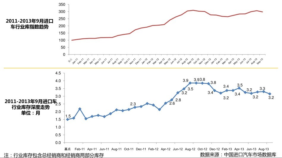 (三)库存仍处高位:进口车库存在2012年上半年达到高点后,四季度和今年一季度处于下调供给、降低库存阶段,9月份行业库存总量有所下降,行业库存压力仍较大,但处于下行趋势。