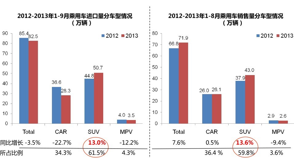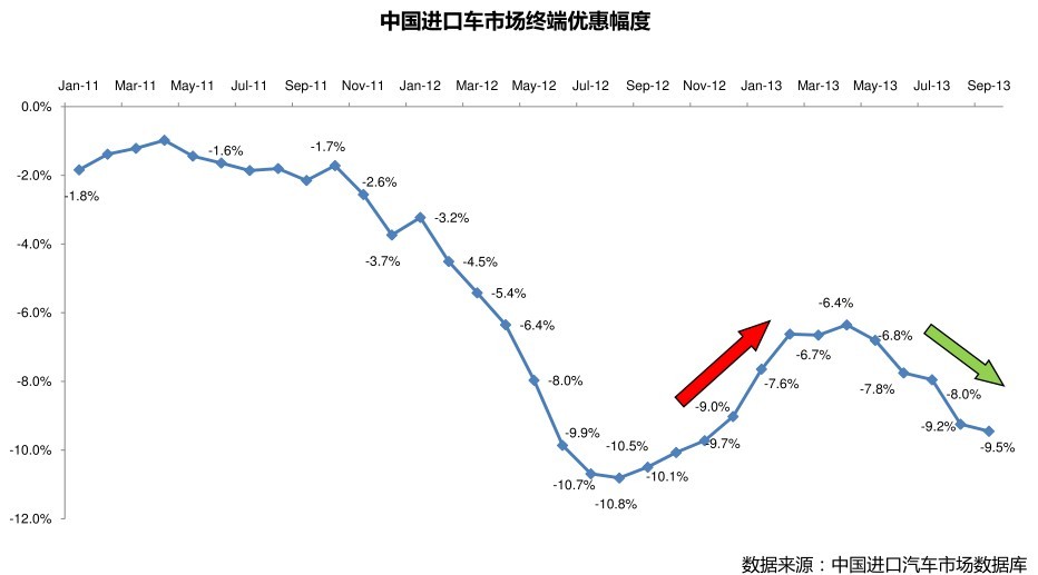 增速下滑缘于2012年下半年跨国公司开始调整供给,2012年第四季度和今年一季度在进口数量方面有所体现。2013年二季度开始结构性补充供给阶段,三季度供给增长8.6%,特别是5-9月均进口量超过10万辆,显示总经销商仍有大量供给计划。