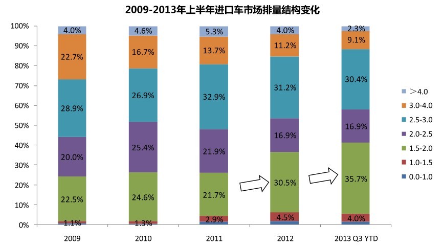 (六)排量下移:在国家相关政策引导下,进口车排量进一步下移,2013年上半年3.0L以下份额达到88.6%,比2012年全年的84.8%提升3.6个百分点。1.5L-2.0L排量区间相比2012年提升5.2个百分点。