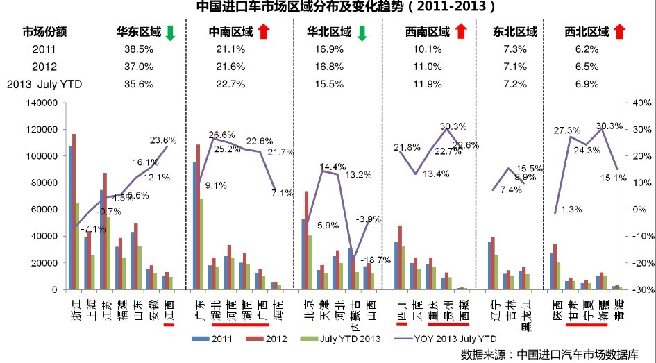 (七)区域中西部化:进口车市场快速向中南、西南和西北区域发展,传统的东部和北部区域市场份额逐年下滑;2013年销售同比增长20%以上的省市均是中西部地区。