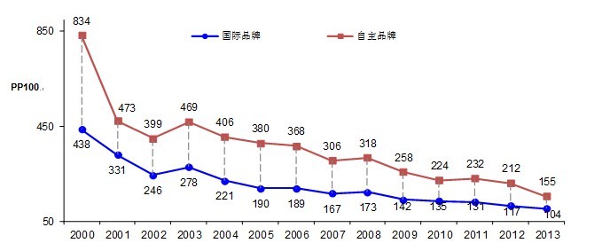 自主品牌的总体新车质量平均为155个PP100,与2012年相比减少了57个PP100。国际品牌的新车质量也取得了进步,从2012年的117个PP100减至2013年的104个PP100。自主品牌与国际品牌之间质量评分差距从2012年的95个PP100缩小至2013年的51个PP100。