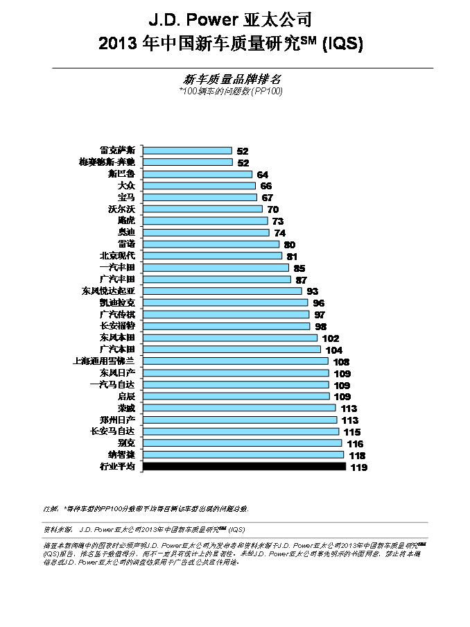 2013年行业总体新车质量平均为119个PP100,实现了从2000年开始新车质量研究以来最低的问题发生率。