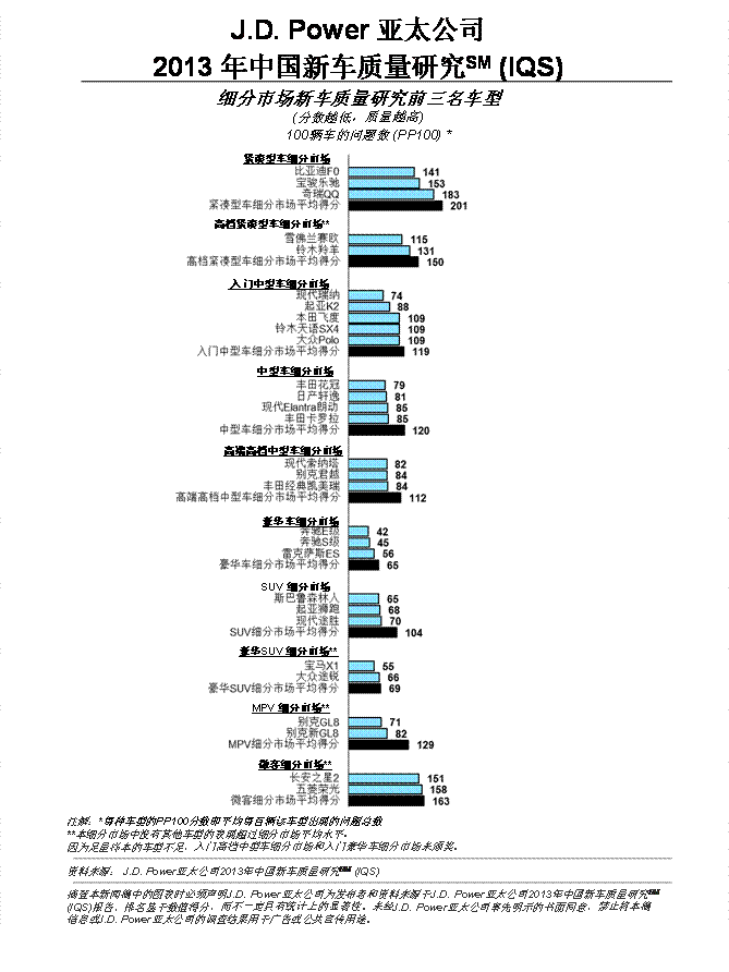 2013年中国新车质量研究是基于2012年10月至2013年6月期间购买新车的21181位车主的反馈。研究报告分析了12个细分市场,一共涵盖65个品牌的213款车型。数据收集工作于2013年4至8月在46个主要城市进行。