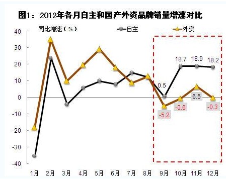 从各月销量增速来看,2012年前8个月中,除7月以外,外资销量增速均高于自主品牌;而9月起,外资销量增速大幅度落后于自主品牌,同时9、10、12月出现销量下滑现象。其中,12月销量同比微降0.3%至76.82万辆。