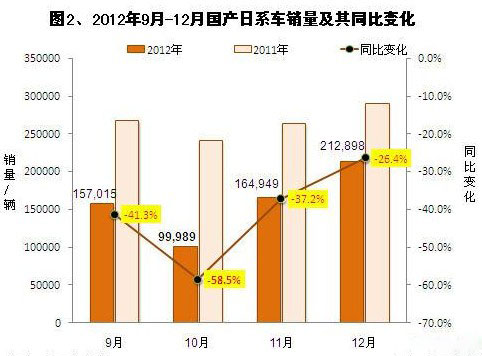外资品牌主要的派系中,日系车销量下滑是拖累外资品牌的最主要因素。2012年,日系车因受钓鱼岛事件影响,全年销量同比下滑近一成(为9.7%),至250.69万辆,市场份额下降3.7个百分点至19.0%。9月至12月,日系车在10月销量跌幅最高,高达58.5%,其销量跌破十万辆(为99989辆),市场份额跌破10%(为9%);11月和12月则呈现明显的复苏态势:销量大幅回升——12月销量回升至21.29万辆;同比降幅收窄至26.4%。