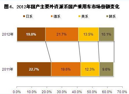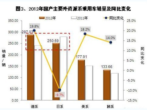 在日系车销量大幅下滑的形势下,德系、美系、韩系受益最大,销量大幅增长。其中,德系车销量增长最快,2012年全年销量增长近两成至287.03万辆,超过了日系的250.69万辆,成为销量最大的外资派系。其市场份额提升2.2个百分点至21.7%,成为市场份额唯一突破20%的外资派系。