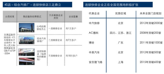 4S店,综合汽修厂及连锁快修店已形成三足鼎立的态势。其中值得注意的是,连锁快修店正在快速渗透。