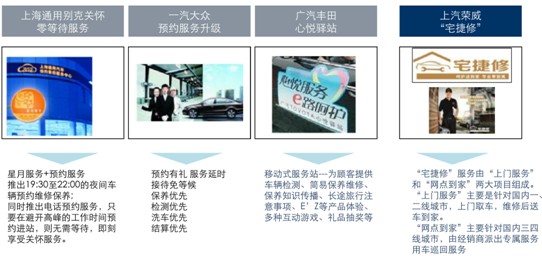 根据新型售后服务理念,企业在规划售后服务产业时要向综合性服务转型,除传统维修及保养外,还要向衍生的一些服务拓展。在这方面,合资品牌企业在售后服务产业涉及的服务点明显多于自主品牌企业。