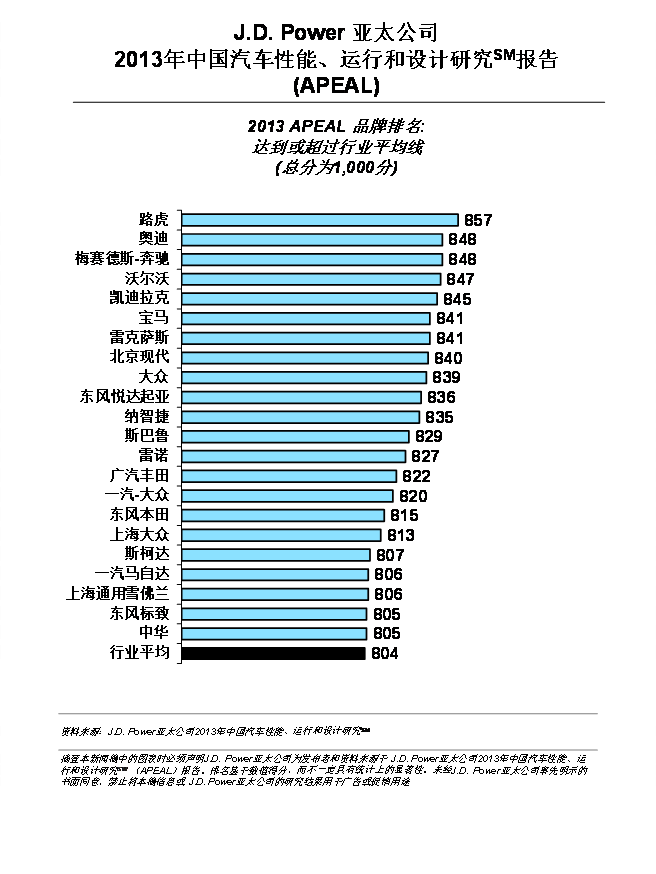 11月29日,J.D. Power亚太公司发布了2013年中国汽车性能、运行和设计研究SM(APEAL)报告。报告显示,在新车魅力方面,中国自主汽车品牌实现了从2003年以来与国际品牌之间的最小差距。