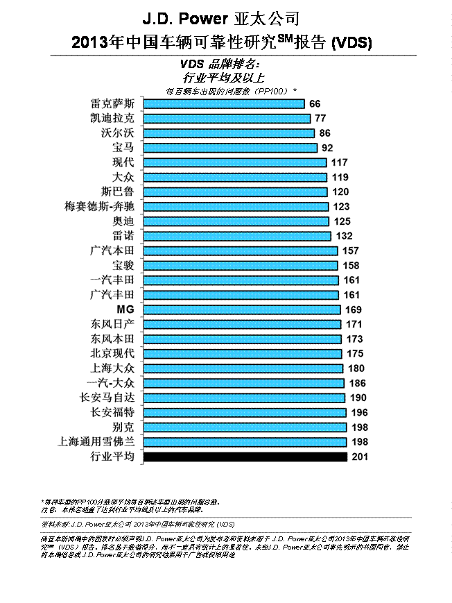 2013年,中国总体车辆可靠性的平均分数为201个PP100,与2012年(196个PP100)相比略有增加。以下类别出现问题数增长:驾车经历、配置/操控/仪表板、空调系统、车身内装和音响/娱乐设备/导航系统。研究也发现,50%的车主声称他们在过去六个月里更换了至少一个零配件。