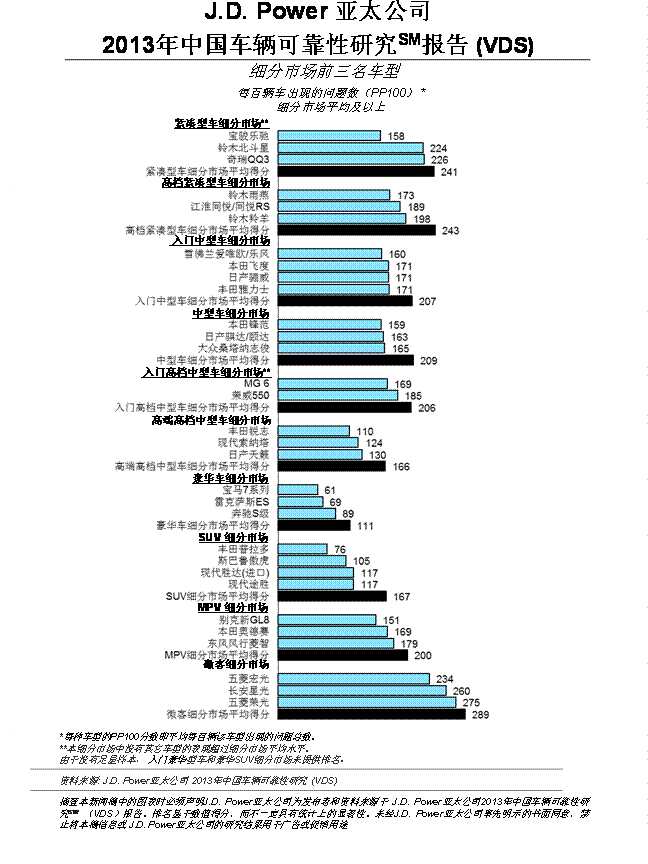 在研究涵盖的12个细分市场中,入门高档中型车和高档紧凑型车细分市场与2012年相比分别减少了43个PP100和19个PP100。微客(289个PP100)和MPV(200个PP100)在2013年是问题数最多的细分市场。