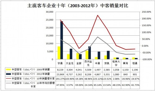 从主流客车企业十年(2003-2012年)客销量对比图中可以看出,宇通、中通两家中型客车(10≥L>7)企业的销量增长最快,但两家呈现出来的特点又有所不同。