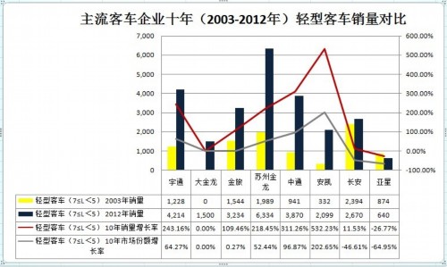 2003年,苏州金龙大型客车的销量仅为779辆;十年后,其销量直线上升,2012年,苏州金龙大客车销售10285辆,增长1220.28%,市场份额也从3.22%上升到12.06%。