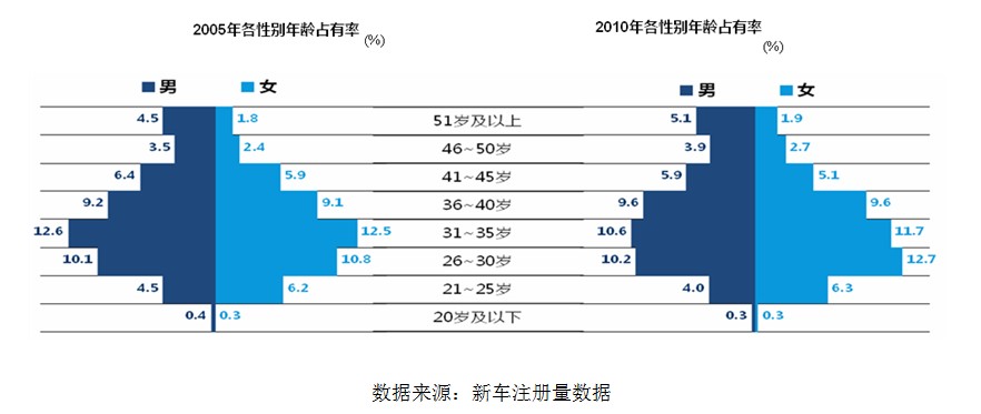 “80后”人群正在逐步成为汽车市场的消费主力,其中女性的影响力也在不断增强。从2005年至2010年的研究数据来看,在21至35岁的购车人群中,女性消费者比例略高于男性,女性已成为新的汽车消费主力。