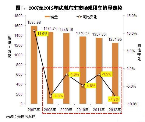 根据盖世汽车网整理的数据,近几年欧洲(欧盟27国 EFTA国)车市命运多舛,在受美国金融危机波及后,又遭遇了欧债危机影响,2008年以来,其乘用车销量持续下滑,至2012年,销量跌至1252.79万辆,较2007年的1595.98万辆下跌21.5%。同时欧洲车市受危机的影响仍看不到转机,今年1-2月,欧洲乘用车销量再度下滑9.3%,至174.81万辆。